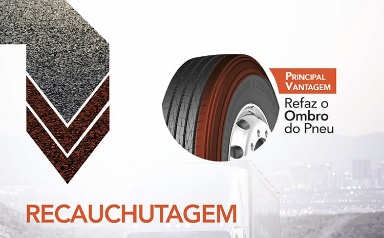 Folheto promocional explorando os benefícios e características do processo de recauchutagem de pneus para caminhões e ônibus.