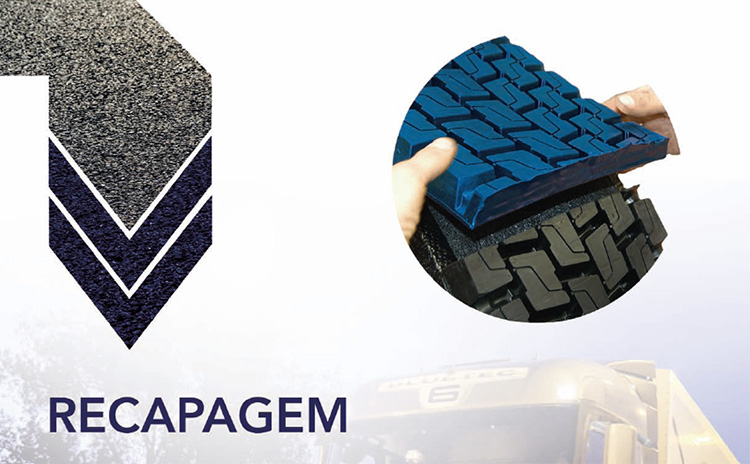 Folheto promocional explorando os benefícios e características do processo de recauchutagem de pneus para caminhões e ônibus.